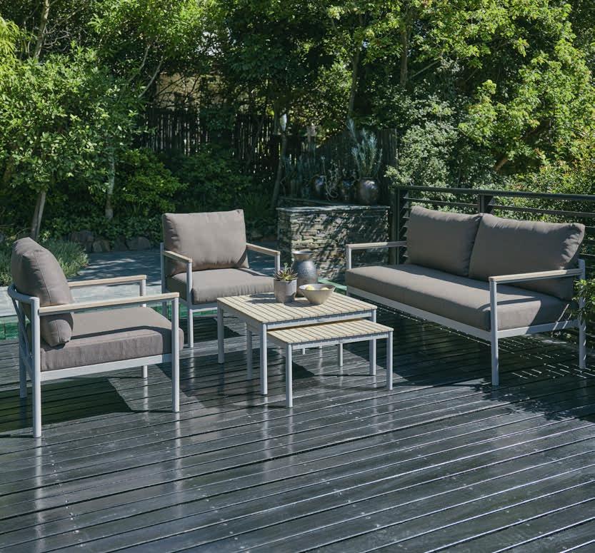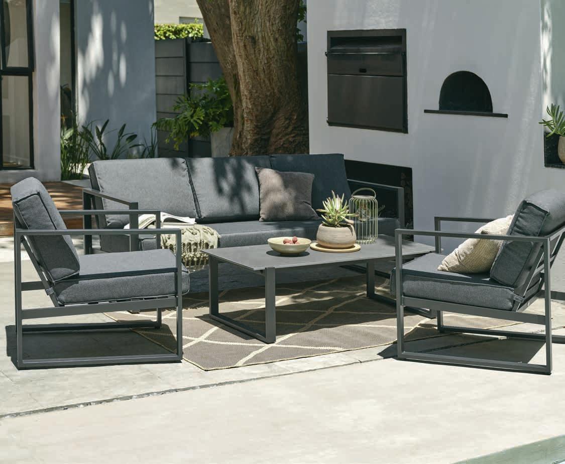 Vrtna garnitura za 5 osoba. Stol: Aluminij i sinterirani kamen. Š64xD130xV39 cm. Trosjed i fotelja: Aluminij. Uključuje luksuzne jastuke s izdržljivom grubo tkanom navlakom. 1.499 € 750€