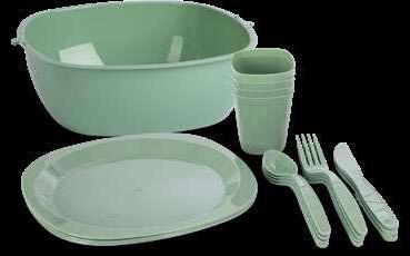 1 poklopac, 1 kutija, 4 tanjura, 4 čaše, 4 noža, 4 žlice i 4 vilice.