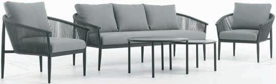 Sto: aluminijum, čelik i keramika. Š65xD127xV35 cm. Produženi dvosed i stolice: čelik. Sa luksuznim jastucima sa dugotrajnom, grubo tkanom navlakom. 89999,-