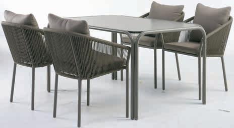 Sto: čelik i kaljeno staklo. Š90xD140xV74 cm. Stolice: aluminijum i poliester. Sa luksuznim jastucima sa grubo tkanom navlakom koja se brzo suši. Mogu da se slažu jedna na drugu. Sto 19999,- 12000,- Stolica* 12999,- 9000,-