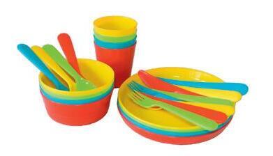 • set sadrži: 4 šalice 200 ml, 4 zdjelice fi 11 cm, 4 plitka tanjura fi 18,5 cm, 4 vilice, 4 žlice, 4 noža