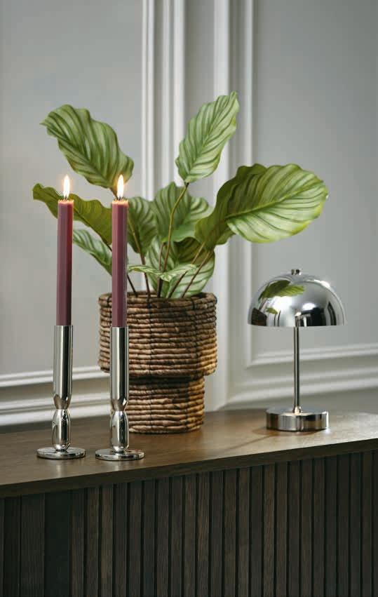 1) HOLME svijeća Pakiranje od 4 komada. Ø2xV20 cm 3,25€ 2) ROLF umjetna biljka Ø35xV55 cm 12,50€ 3) ADRIAN svijećnjak Ø7xV19 cm 10€ 4) PETTER tegla za cvijeće Ø19xV21 cm 9,50€ 5) KENT baterijska lampa Krom. S upravljanjem na dodir, 3 razine osvjetljenja i timerom. Baterije nisu uključene. Ø16xV25 cm 20€