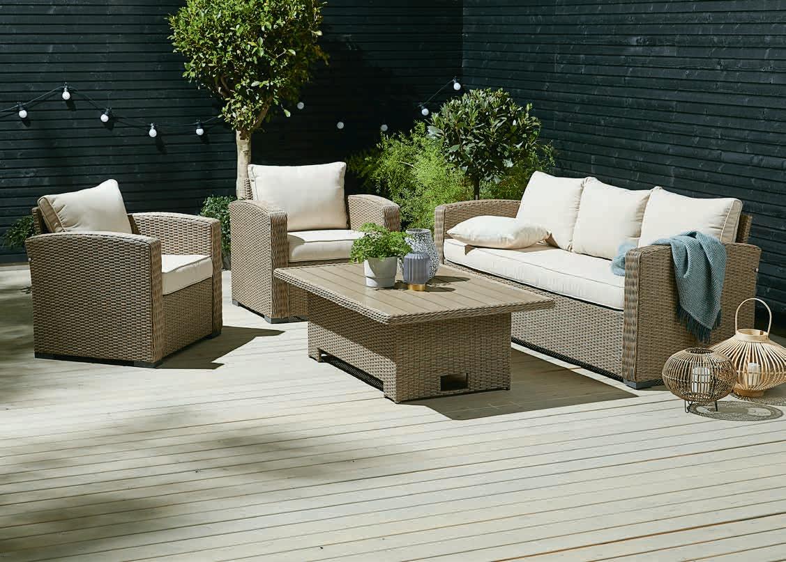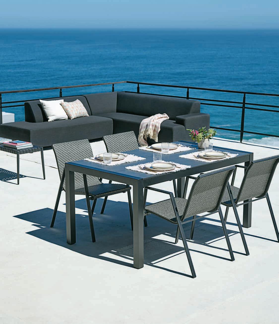 Stol: Aluminij i vlaknasti cement. Š70xD110xV42 cm. Trosjed i stolice: Aluminij i petan. S luksuznim jastucima s grubo tkanom navlakom koja se brzo suši. 1299 €