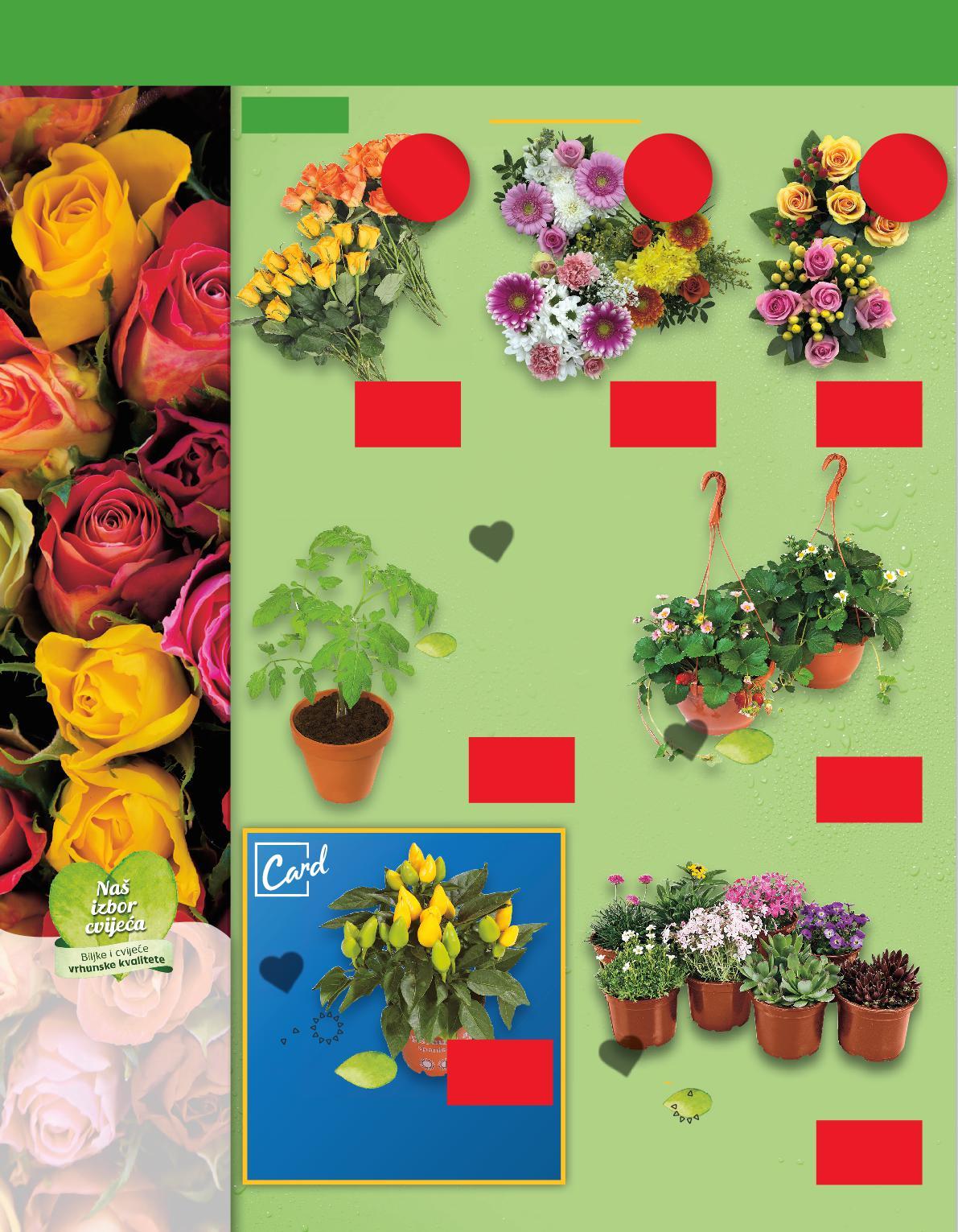 Buket ruža 30 cm pakiranje od 11 komada Buket mix 40 cm komad Buket ruže i hypericum 40 cm pakiranje od 10 komada samo 2.29€ samo 5.99€ samo 4.49€ Jagoda u visećoj tegli komad zalijevati redovito samo 5.49€ samo 1.29€ Trajnice komad Papričice chilli idealne za uzgoj na balkonima komad zalijevati redovito samo 1.39€ samo 0.69€