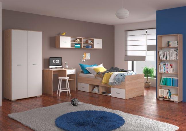 3: Soba za mlade Karmen, boja: sonoma/bela, osnovni sastav: 2-krilni ormar 90x191x55 cm, krevet 96x65x203 cm, regal 59x176x25 cm i viseći element 204x39x25cm. Letvice, dušek dostupni uz doplatu (05860104/01)