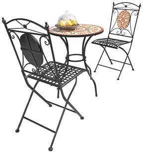 12: Modularna baštenska garnitura Mina , aluminijumska konstrukcija, ploče od masivnog drveta, 6 jastuka za sedenje i 7 za naslon. Sastoji se od: stola dim. 120x30x70 cm nosivosti do 30 kg i 2 klupe dim. 232x73x74 cm nosivosti do 360 kg. U cenu je (00600015/09) 13: Set za baštu ili terasu Wien / Belvedere sastoji se od dve sklopive baštenske stolice i stola od kovanog gvožđa u crnoj / beloj boji sa keramičkim mozaikom (05380002, 009/09)