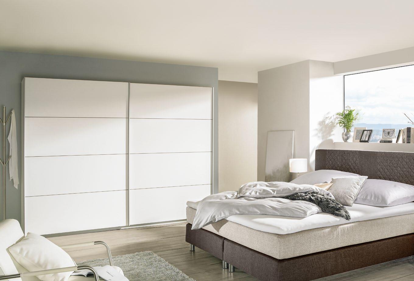 4: Ormar s kliznim vratima Kulmbach, boja: siva, front: sivo staklo/ogledalo, 3 vrata, 3 police, 3 šipke za odeću, dim. 271x229x62 cm. Boxspring krevet Tabea, presvlaka antracit boje, dim. 184,5x111x227 cm, ležaj dim. 180x200 cm, boks od