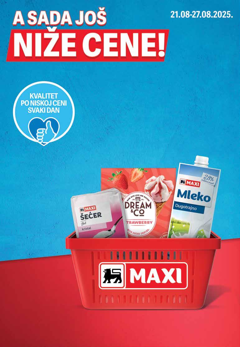 Akcijska ponuda važi od 21.08. do 27.08.2025. osim za artikle pored kojih je naveden drugačiji period trajanja akcije ili do isteka zaliha. Nastojimo da obezbedimo dovoljne količine proizvoda koji su na akciji. Može da se desi da zalihe određenih proizvoda nestanu pre kraja trajanja akcije. Akcijska ponuda važi u objektima u čijem asortimanu se nalaze prikazani artikli. Spisak objekata u kojima važi akcijska ponuda nalazi se na web-stranici akcijskog kataloga – Maxi nedeljna akcija. Moguća su odstupanja u raspoloživosti artikala na akciji prikazanih na lifletu, u odnosu na one koji su raspoloživi u konkretnom maloprodajnom objektu, što je uslovljeno formatom objekta, kao i prostorno-tehničkim mogućnostima konkretnog maloprodajnog objekta. Prikazane cene u lifletu su izražene u dinarima sa PDV-om i odnose se na jedinične proizvode. Ne odgovaramo za moguće štamparske greške. Fotografije ne moraju u potpunosti odgovarati stvarnom izgledu proizvoda. Sve svoje sugestije možete nam preneti putem e-mail adrese: potrosaci@delhaize.rs ili besplatnim pozivom MAXI call centra 0800 3537 030. Napominjemo da u pojedinim Maxi objektima može doći do odstupanja u prikazanim redovnim cenama. Prikazane redovne cene važe u najvećem broju Maxi objekata. U Beogradu, Pančevu i Novom Sadu.