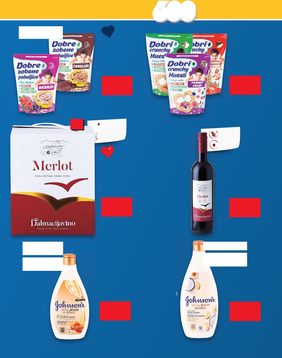 samo 16.99€ 0.99€ (= 1 l 3,40€) DALMACIJAVINO Merlot Hrvatska gastro preporuka: uz drniški pršut, zrele sireve 5 L (=1 kg 13,30€) DOBRE Zobene pahuljice čokolada ili bobičasto voće 300 g samo 3.99€ Pronađi više od 600 RAZLIČITIH PROIZVODA SNIŽENIH UZ KAUFLAND CARD OVAJ MJESEC crno kvalitetno vino samo 6.99€ (=1 l 10,23€) JOHNSON`S Gel za tuširanje Vita-Rich bademovo ulje i shea maslac 400 ml (=1 kg 13,30€) DOBRI Hrskavi muesli razne vrste 300 g samo 4.09€ 3.99€ -20% -20% -20% -20% samo JOHNSON`S Gel za tuširanje Vita-Rich jogurt, breskva i kokos 750 ml (=1 l 9,32€) crno kvalitetno vino amo 7.99€ -20% DALMACIJAVINO Merlot Hrvatska gastro preporuka: uz drniški pršut, zrele sireve 0,75 L (=1 l 10,66€) ✓3 minute pripreme s vrućom vodom ✓obogaćen uljem badema ✓poboljšava elastičnost kože ✓kremasta tekstura ✓za meku i nahranjenu kožu -20% 5L S51-HR-KW17-LFT-NOVITETI_1_D-1030-11 51