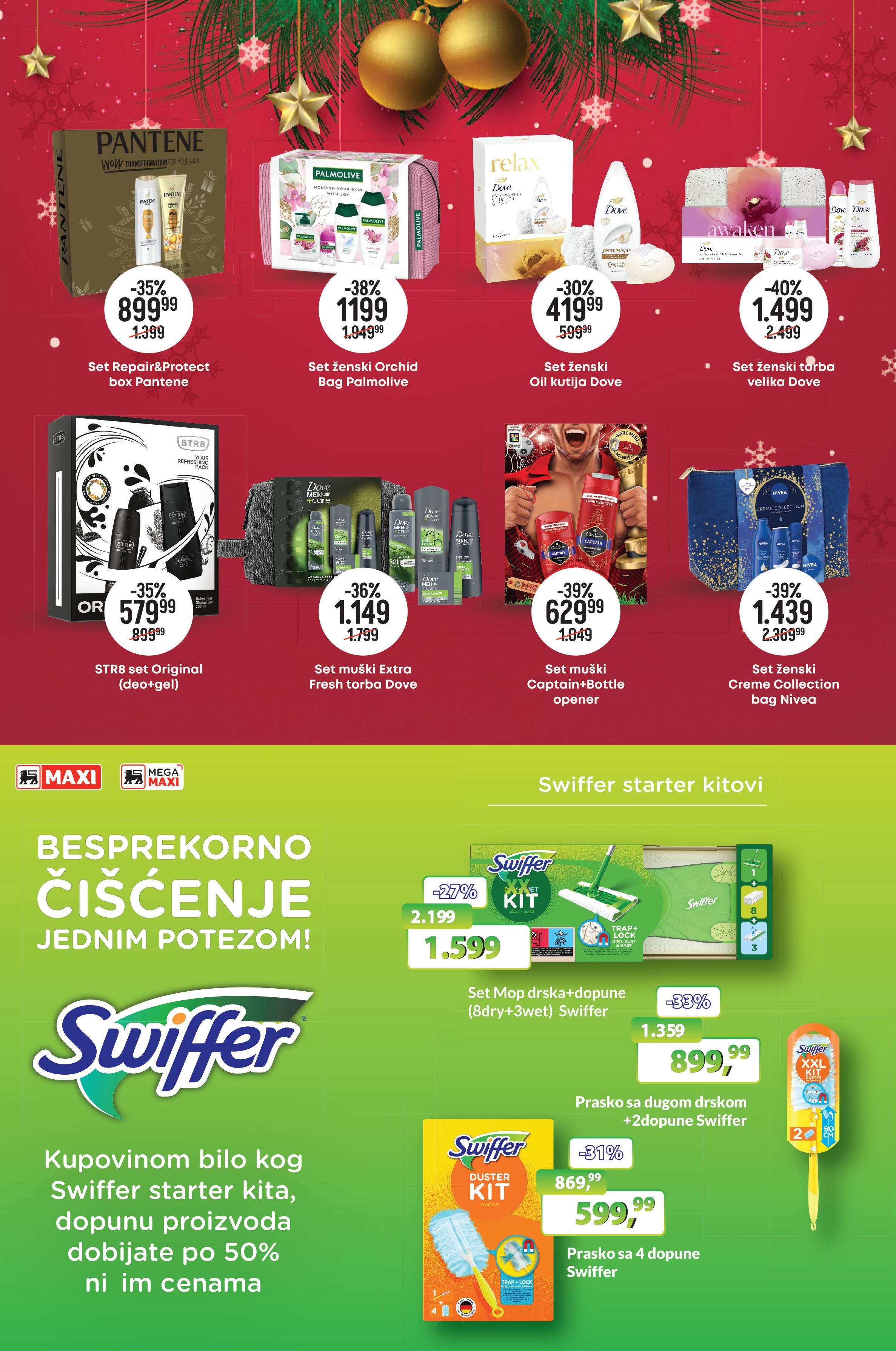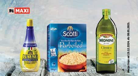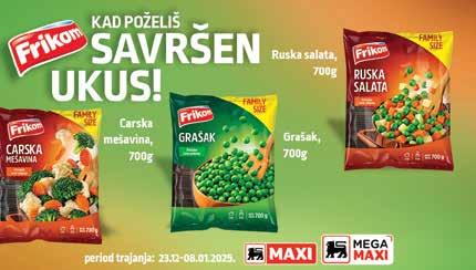 Akcijska ponuda važi od 23.12.2024 do 08.01. 2025. osim za artikle pored kojih je naveden drugačiji period trajanja akcije ili do isteka zaliha. Nastojimo da obezbedimo dovoljne količine proizvoda koji su na akciji. Može da se desi da zalihe određenih proizvoda nestanu pre kraja trajanja akcije. Akcijska ponuda važi u objektima u čijem asortimanu se nalaze prikazani artikli. Spisak objekata u kojima važi akcijska ponuda nalazi se na web-stranici akcijskog kataloga – Maxi nedeljna akcija. Moguća su odstupanja u raspoloživosti artikala na akciji prikazanih na lifletu, u odnosu na one koji su raspoloživi u konkretnom maloprodajnom objektu, što je uslovljeno formatom objekta, kao i prostorno-tehničkim mogućnostima konkretnog maloprodajnog objekta. Prikazane cene u lifletu su izražene u dinarima sa PDV-om i odnose se na jedinične proizvode. Ne odgovaramo