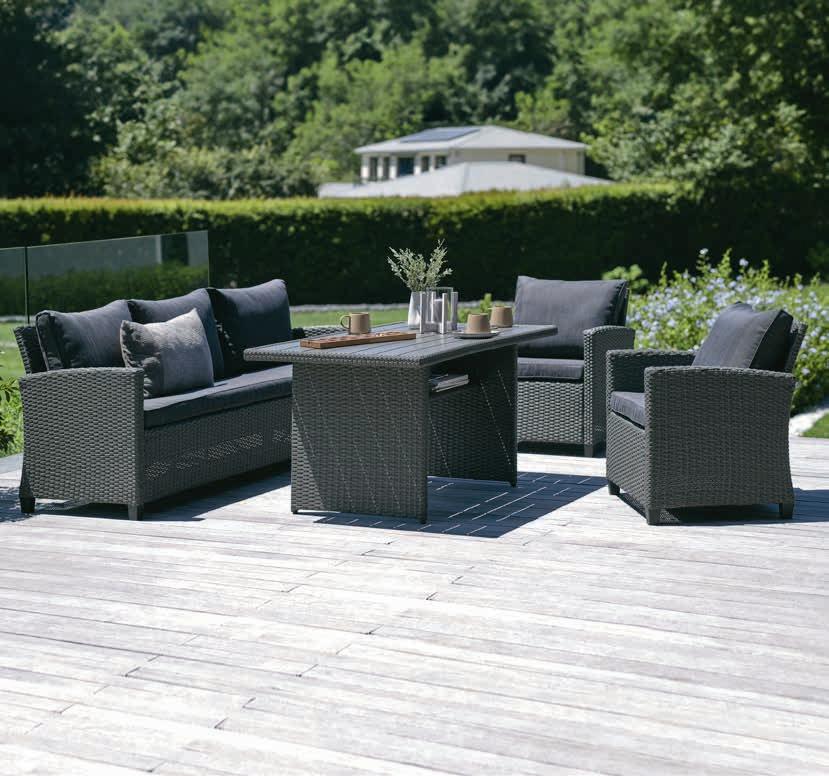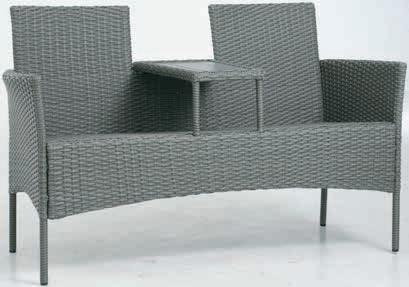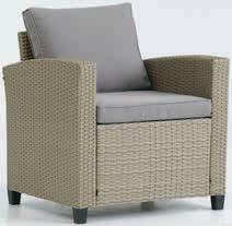 Sto: čelik, veštačko drvo i petan. Š75xD130xV67 cm. Trosed i stolice: čelik i petan. Sa jastucima sa dugotrajnom, grubo tkanom navlakom. 74999,-