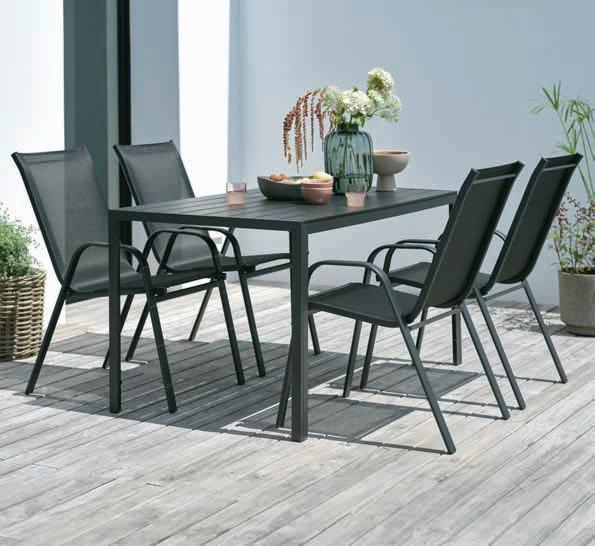 Stol: Aluminij i umjetno drvo. Š100xD220xV74 cm. Stolice: Aluminij i tekstilen. 6 položaja. Sklopive. Stol 649 € 325€ Stolica 119 € 75€