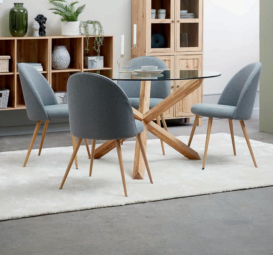 Sto: masivna hrastovina i kaljeno staklo. Ø119xV75 cm. Stolice: tkanina i čelik. Sto 36999,- 25000,- Stolica 8499,- 4250,-