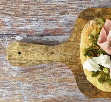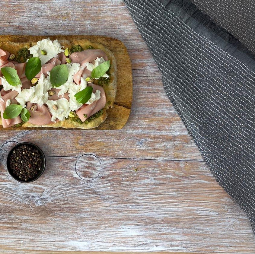 Pecite pinsu 5 - 8 minuta u pećnici prethodno zagrijanoj na maksimalnu temperaturu. Kad se pinsa ispeče, dodajte sastojke, pesto, izrezanu mortadelu i razmrvljenu burratu. Na kraju ukrasite s nekoliko listića bosiljka.