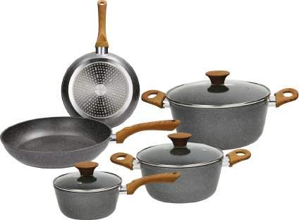 Set posuđa Stone&Wood Tognana stone nonstick premaz, posuđe pogodno za korištenje i na indukcijskim štednjacima, 8-dijelni set sadrži: duboku tavicu s dugom ručkom i poklopcem, Ø 16 cm duboku posudu s ručkom i staklenim poklopcem, Ø 20 cm duboku posudu s ručkom i staklenim poklopcem, Ø 24 cm tavu Ø 24 cm i tavu Ø 28 cm