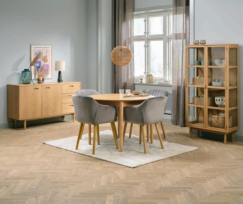 Stol: Masivno drvo i furnir hrasta. Ø110xV75 cm. S 2 dodatna krila. Veličina kada se produži Š110xD200xV75 cm. Stolice: Tkanina od baršuna i masivno drvo. Stol 449 € 315€ Stolica 119 € 65€