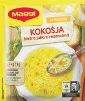 abeceda 44 g, švicarska juha 49 g, juha od rajčice s rezancima 62 g, kokošja bistra juha 58 g, krem juha od gljiva 52 g, alpska juha 46 g, pileća krem juha 54 g