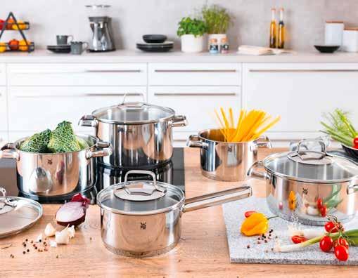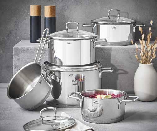 7: Set lonaca Profi Collection 5/1, oplemenjeni čelik 18/10 sa satiniranom završnom obradom, sastoji se od 5 lonaca različitih zapremnina i 4 staklena poklopca, laserski urezana mjerna skala, široki rub za izlijevanje, pogodno za sve vrste štednjaka. Mlinac za sol i papar X-Plosion 3/1, sa stalkom od masivnog drveta bagrema, nehrđajući čelik/keramički nož, finoća mljevenja od ekstra grubog sve do finog praha, 14x6,8x14 cm (37240455/01;54300499/09)