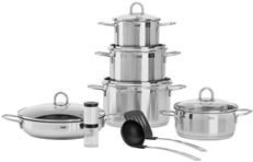 4: Set lonaca za kuhanje Diamant 9/1, oplemenjeni čelik 18/10, set sadrži 4 lonca različitih veličina i zapremnina i tavu Ø 28 cm, s uključenim staklenim poklopcima, set kuhinjskih pomagala te posipač za sol, pogodno za sve vrste štednjaka i perilicu posuđa. (37310738)