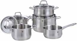 6: Set lonaca za kuhanje Belmonte 5/1, nehrđajući čelik 18/10, sastoji se od dva lonca Ø 16 i po jednog lonca Ø 20 cm i Ø 24 cm, te četiri staklena poklopca, s ručkama koje se vrlo sporo zagrijavaju, pogodno za sve vrste štednjaka i perilicu posuđa. Set kuhinjskih pomagala 5/1, Cromargan® nehrđajući čelik 18/10, s uključenim nosačem (37312613;1662)