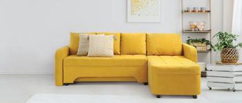 350 € 551 € Kutna garnitura HANA II, 220x155cm, ležaj 125x200cm, spremnik, lijevi ili desni kut, 4x jastuk za naslon, cijena vrijedi za materijal Mercury 201 (žuta, isporuka odmah) i 111 (tamno plava, za narudžbu).