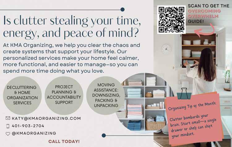 KMA Organizing provides inhome and small-business decluttering and organizing services. We empower individuals to reclaim their living spaces by transforming their homes into serene, clutter-free sanctuaries. We deliver personalized decluttering and organizing solutions that enhance functionality, efficiency and peace of mind. See ad, page 19.