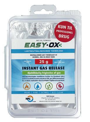 I gassform oksiderer klordioksid permanent lukt forårsaket av røyk, sot, muggsopp, forråtnelse og all lukt av annen organisk opprinnelse uten å etterlate rester. EASY-OX-gassen kan brukes alene eller i kombinasjon med NOVA-OX ClO2-væske, som beskrevet i NOVA-OX-brosjyren.