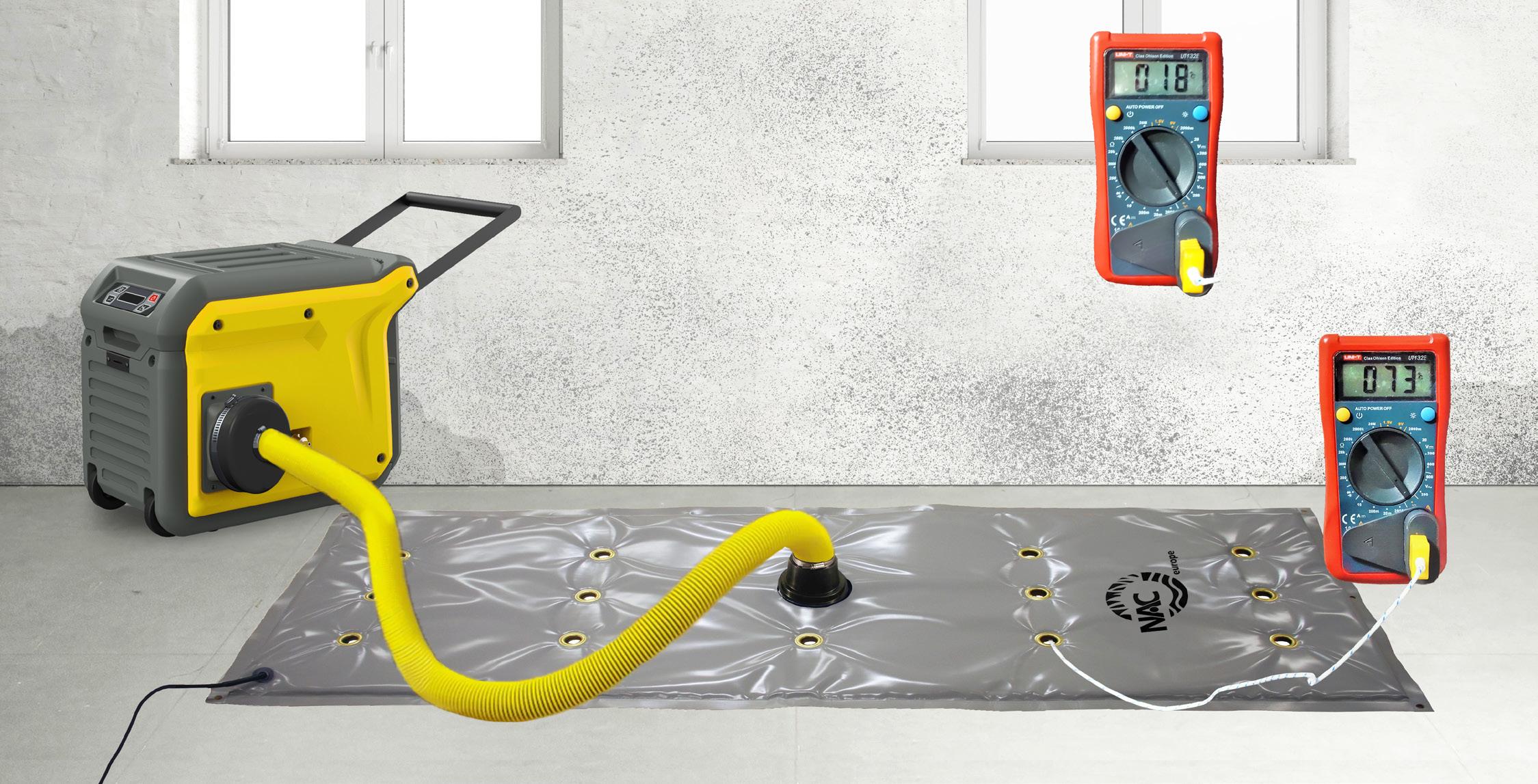 Varm, tørr luft fra utløpet på Ecor Pro EPD170LGR kondensavfukter ledes ved hjelp av en fleksibel slange montert på mattens tapp inn i mattens hulrom, hvorfra den varme luftstrømmen ledes ut gjennom 60 små hull fra mattens underside. Fuktig luft fra gulv og rom absorberes av avfukteren og avfuktes.