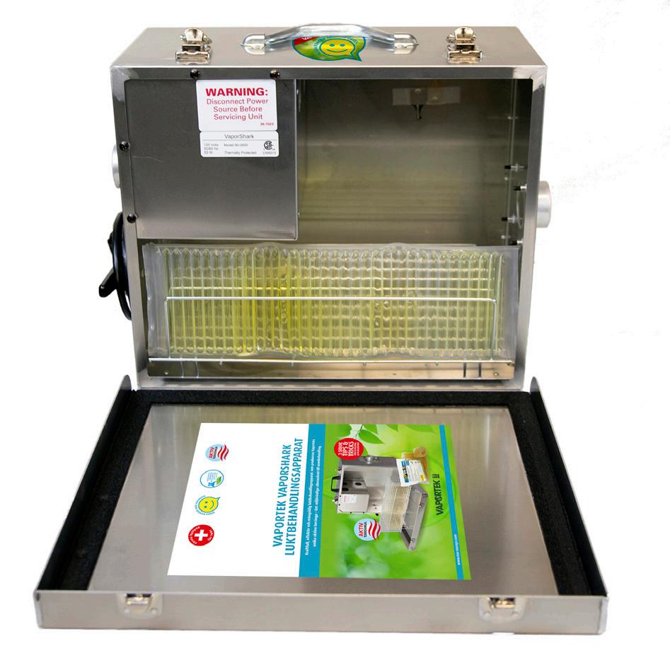VaporSharkeneretenkelt,alsidigt,bærbart,elektriskapparatsomanvenderenuskadeligteknologi, somhurtigt,effektivtogpermanentfjernerildelugt ogfornyerluften indendørsrum.VaporSharken anvenderVaportekspatenteredemembransystem, somindeholderenkompleksblandingafover30 forskelligeog100%naturlige,æteriskeolier. Denbehandlerområderoptil2500m (800m pr. membranogenhedenerdesignettilatrummeop tiltremembraner)foreffektivtateliminerelugtforureninghurtigtogsikkert.Enhedenerprimært beregnettilatlevereenhurtiglugtneutraliserende behandling med høj intensitet. En karakteristisk neutraliserendeduftvilværeatmærkeunderdrift, datørdampafæteriskeoliercirkulerergennemhele behandlingsområdet.Resterendeduftforsvinder løbetaffåtimerefterbehandlingenerafsluttet. GENERELLEINSTRUKTIONER PlacérVaporSharkpåenfast,stabiloverfladepå etrelativthøjtsted.Kanbrugesfritståendeeller permanentinstalleret luftventilationssystemer. Førståbnesluftindtagetca.1,5cm.Efter10-15 minutterskalluftindtagetjusteresefterbehovfor entenatreduceretørdampfrigivelseellerøgetørdampfrigivelse(luk/åbenmere).NårVaporSharken ikkeer brug,læggesmembranerneidenlufttættepose,somplaceres dåsen(beggemedfølger). Lugtsaneringenkanklarespå15-60minutterved lettelugtgener.Vedmerealvorligelugtgenerkan behandlingentagefleretimerellerdage. FREMGANGSMÅDEVEDANVENDELSE AFVAPORSHARKEN: 1. Forudforanvendelsenerderforetageten genereloggrundigrengøringsamtfjernelseaf kildentillugtenf.eks.fjernelseafsodpartikler m.v.Vask/skyleventueltalleoverfladermed enaffølgendeVaportekECOZvådlugtsaneringskoncentrater:SOS(SmokeOdourSolution), ClassicNeutral,SummerOrangeellerLemon. VaporSharkenplaceresidetrum,somønskes lugtbehandlet.Placérapparatetsåhøjtsom