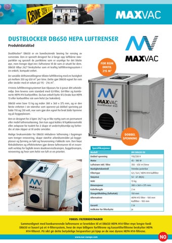 Den nye MAXVAC Dustblocker DB650 er en unik luftrenser med dobbel spenning som fungerer på både 110V og 230V, designet for å fjerne det usynlige støvet i et arbeidsområde. Det anbefales først å fjerne alt synlig støv, men ikke alle støvpartikler kan fjernes ved manuell rengjøring (feiing/støvsuging).