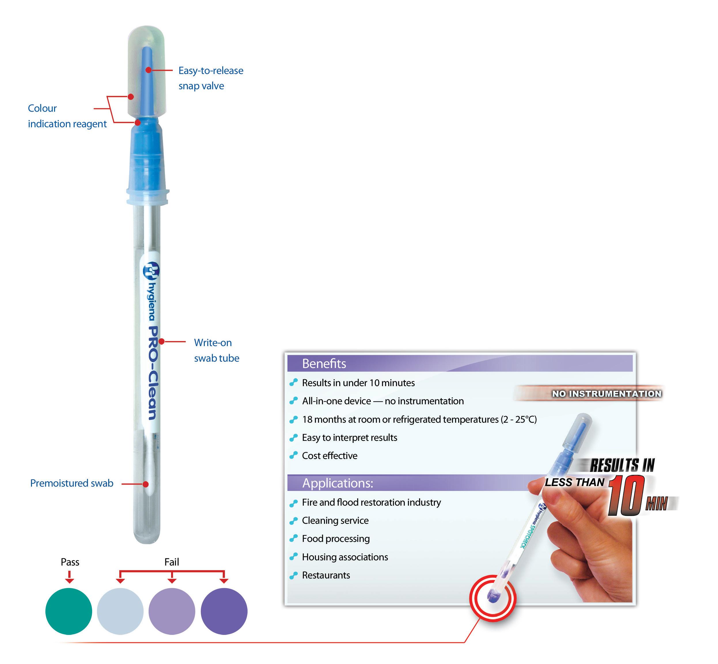 PRO-Clean is a quick and easy way to accurately monitor the cleanliness of surfaces to help ensure product quality. PRO-Clean detects protein residues left on a surface after cleaning. Simply swab a surface, release the reagent and if protein residue is present the reagent will turn purple.