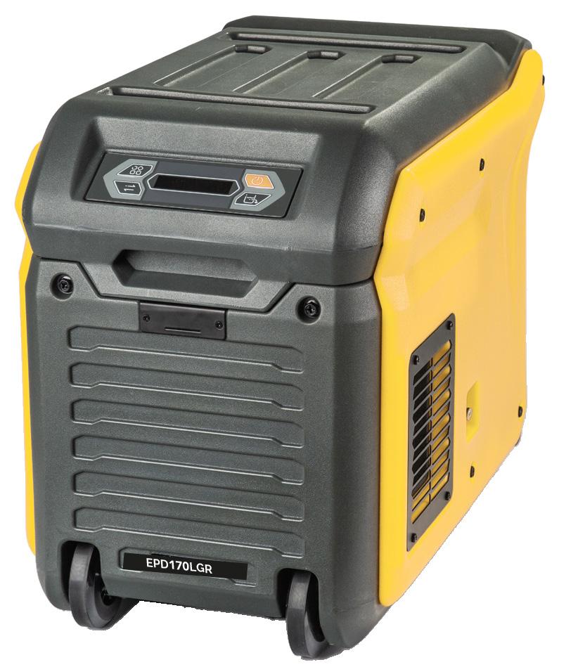 Siste skudd på stammen er de nye toppmoderne EPD100LGR, EPD170LGR og EPD330LGR kondensavfuktere. LGR står for "Low Grain Refrigerant". En vanlig kondensavfukter fungerer på et veldig enkelt prinsipp. En vifte trekker fuktig luft inn gjennom fordamperen, hvor luften avkjøles til under duggpunktet. Vanndampinn-holdet i luften kondenserer på den kalde overflaten av fordamperen og samles i en vanntank eller dreneres til avløp via en innebygd kondenspumpe. Den kalde tørre luften fortsetter gjennom kondensatoren, hvor den varmes opp, for så å blåses ut i rommet igjen, klar til å absorbere ny fuktighet fra rommet. Denne prosessen fortsetter inntil ønsket luftfuktighet er oppnådd.