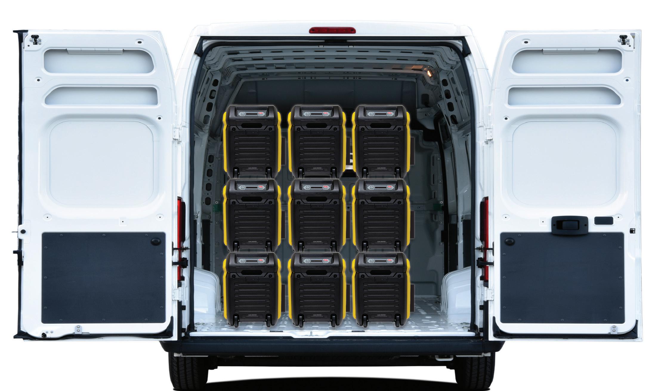 Bildet under viser at 9 kompakte og stablebare EPD170LGR avfuktere enkelt kan oppbevares i samme bil.