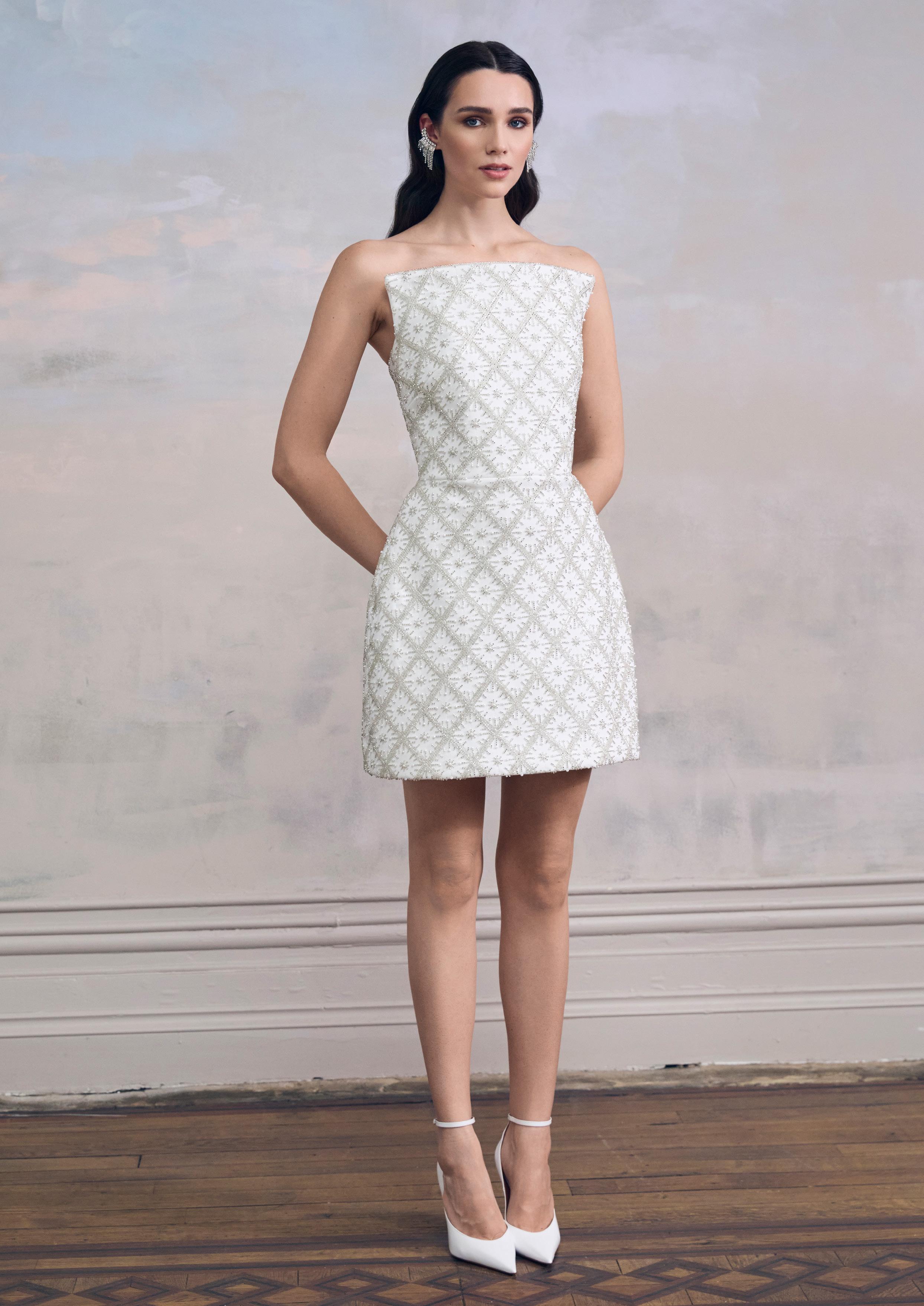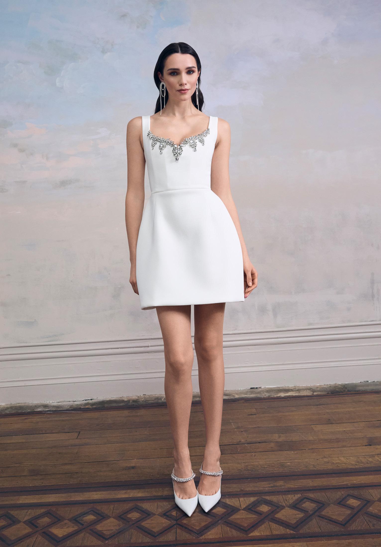 BLAIR WHITE DRESS Crafted from our signature luxe crepe fabrication and designed with a sweetheart neckline embellished with jewel droplet detailing.