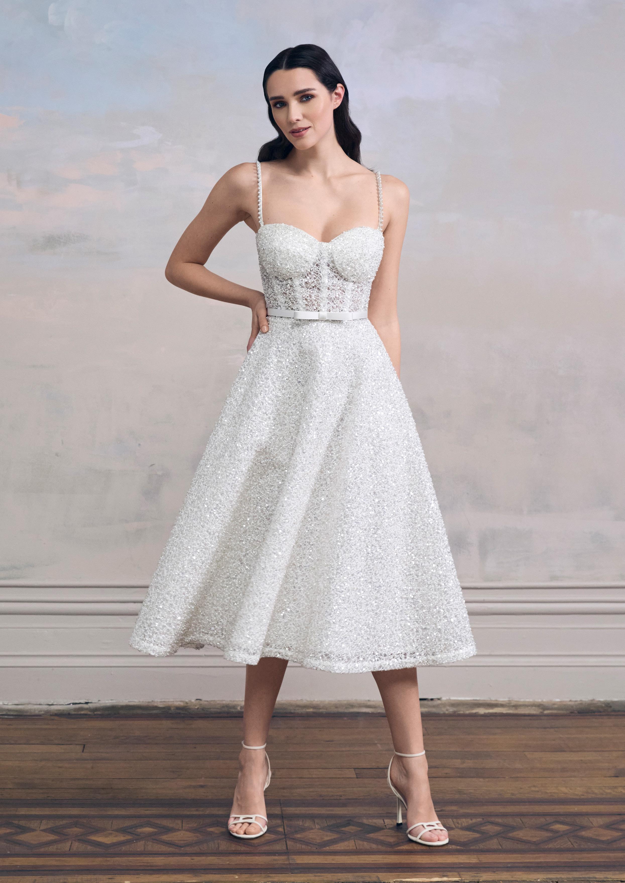 MELISSA WHITE DRESS Each sequin leaf embellishment is thoughtfully placed to create the perfect balance of coverage and allure, for every step of your bridal journey.