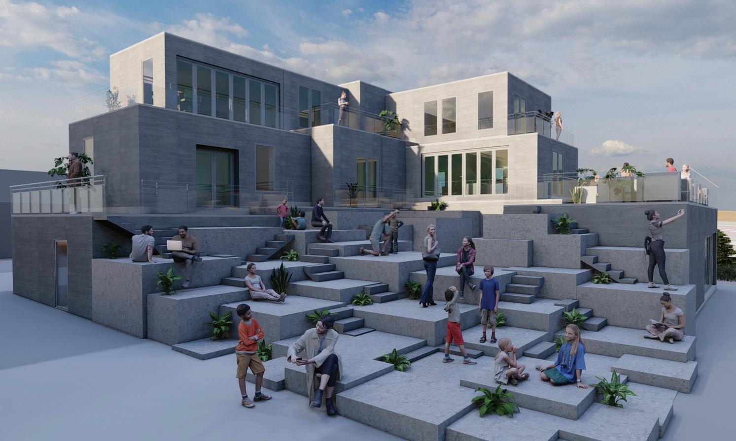 This project interacts with the ground level and the residential spaces on its top floors with elevating steps that ascend from the sidewalk. This project houses four residential apartment units and a lobby entrance with commercial space for restaurant use, all tied together with the outdoor urban space. The outdoor urban space allows people to walk, sit, and gather with access from the sidewalk up to the restaurant’s roof level.