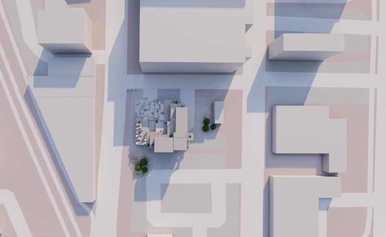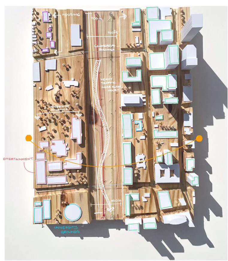 The solace, spanning over Highway 85, is collaboratively designed by a group of peers to bridge the gap between downtown and mid-rise parts of Atlanta providing a space for activity and comfort in the busy city. The design is composed of modular sections containing a combination of office, retail, and outdoor garden spaces. Through this program, Solace address the food desert and lack of collaboration spaces in the city with garden and community spaces. Steel columns and trusses hold plates that situate this structure over the existing highway- creating a sanctuary above. And to promote circulation within programs, steel truss rings connect people throughout different levels of the site.