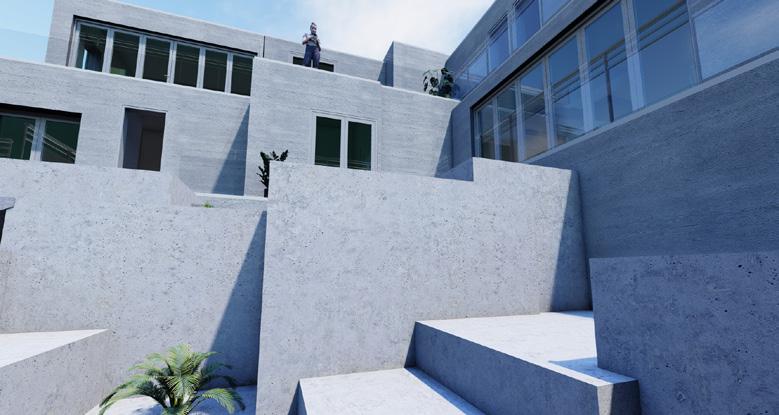 This project interacts with the ground level and the residential spaces on its top floors with elevating steps that ascend from the sidewalk. This project houses four residential apartment units and a lobby entrance with commercial space for restaurant use, all tied together with the outdoor urban space. The outdoor urban space allows people to walk, sit, and gather with access from the sidewalk up to the restaurant’s roof level.
