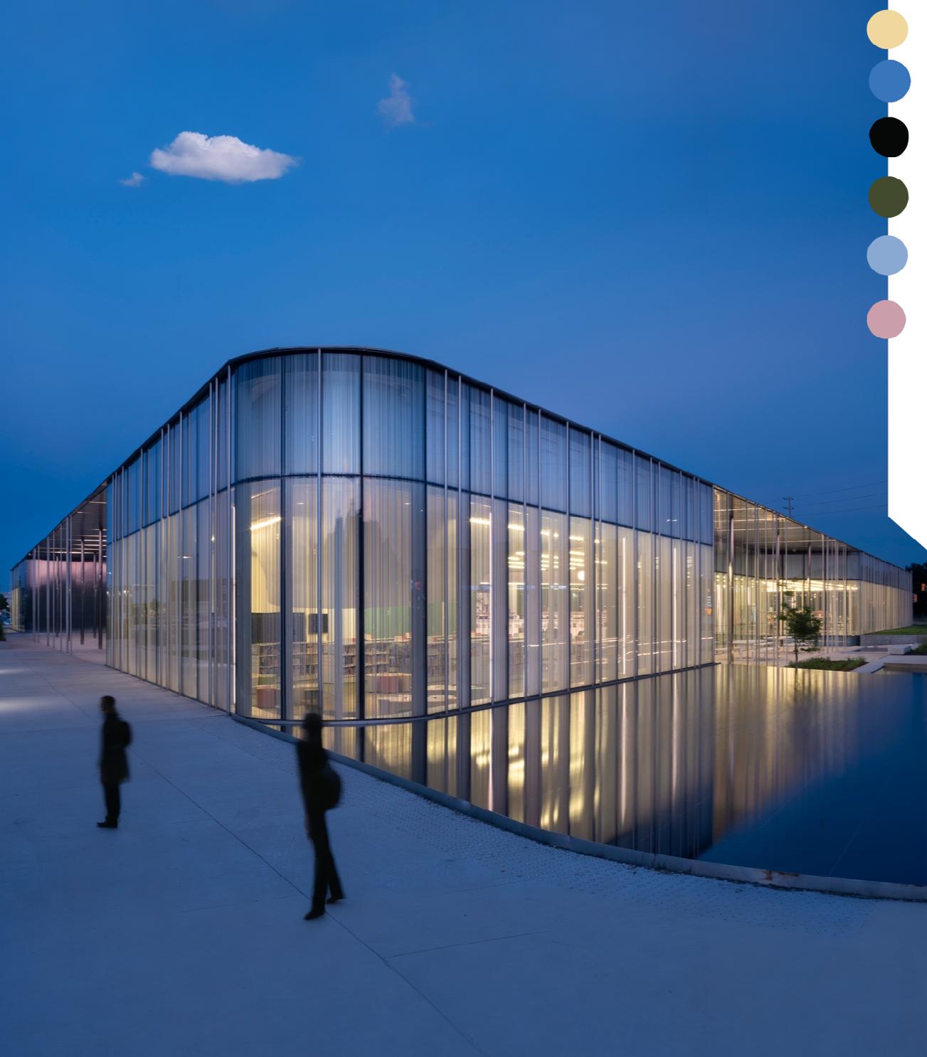 La biblioteca tiene una fachada acristalada que permite la entrada de luz natural y ofrece vistas al parque.