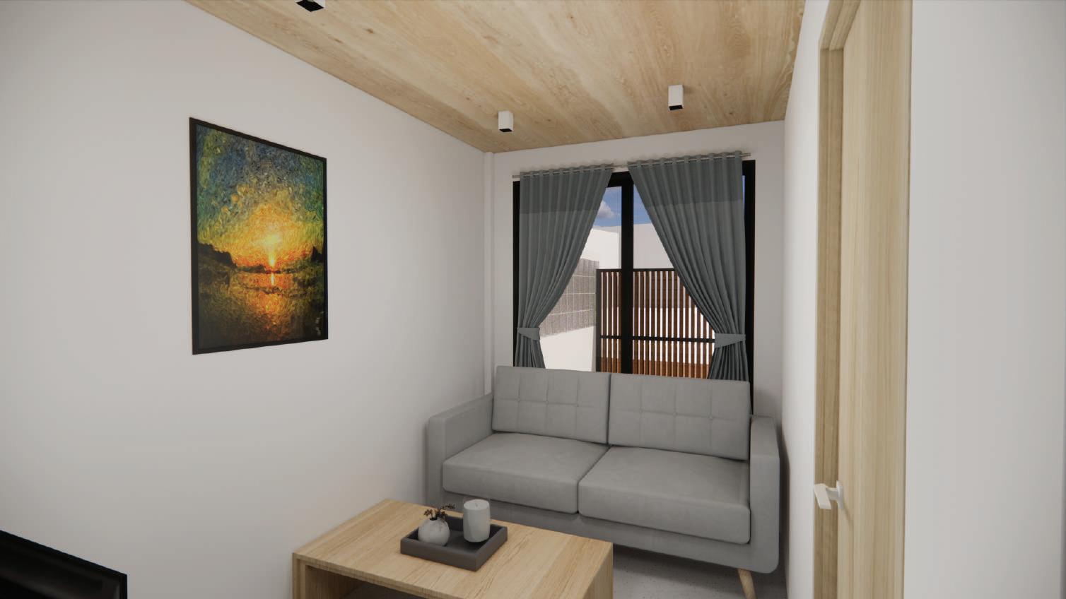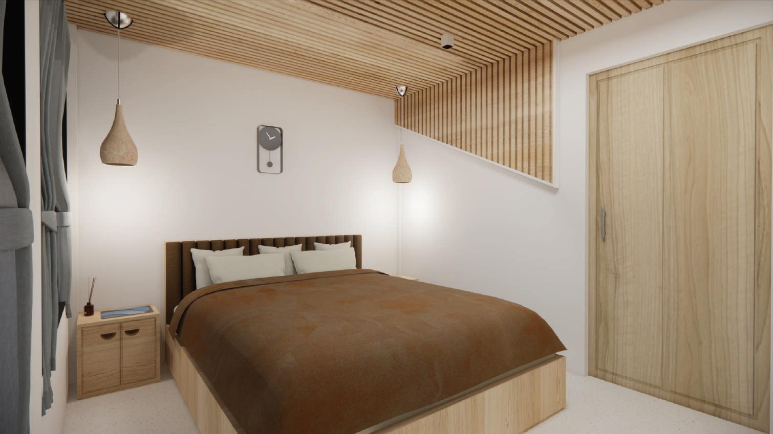Mame House is a project designed in a 48sqm area with the restriction height of 8 meters. The house must consists of 2 bedrooms, a bathroom, a living room, a functional kitchen and dining room, and a food security implemented room.