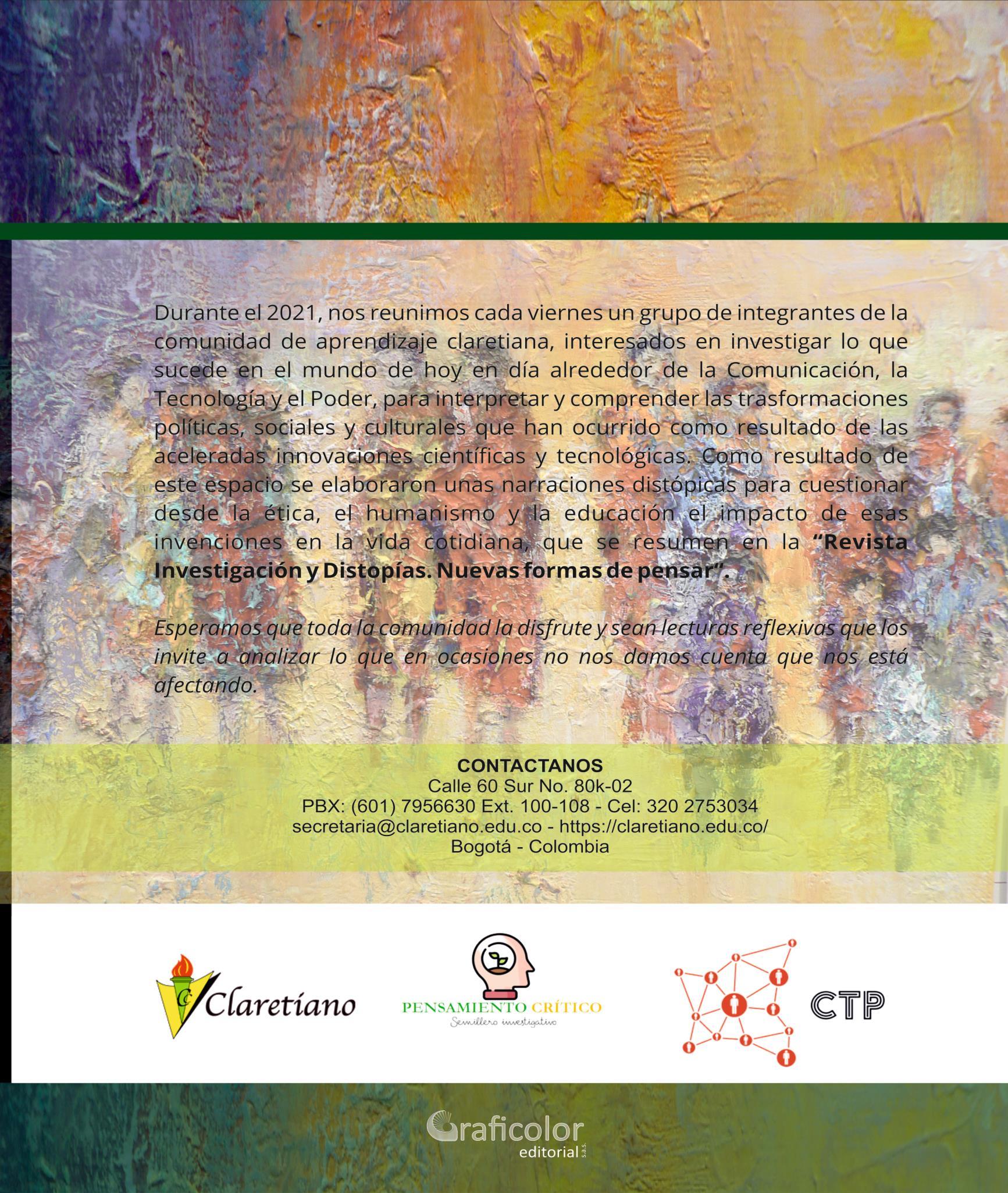 Trabajo colectivo y esfuerzos conjuntos, estas son las premisas centrales de la presente obra, que es el resultado del proyecto llevado a cabo durante el año 2021 en la línea investigativa Comunicación, Tecnología y Poder (CTP) del Semillero Investigativo de Pensamiento Crítico del Colegio Claretiano (Bogotá, Colombia), iniciado desde el 2020 por el áreadecienciassociales.