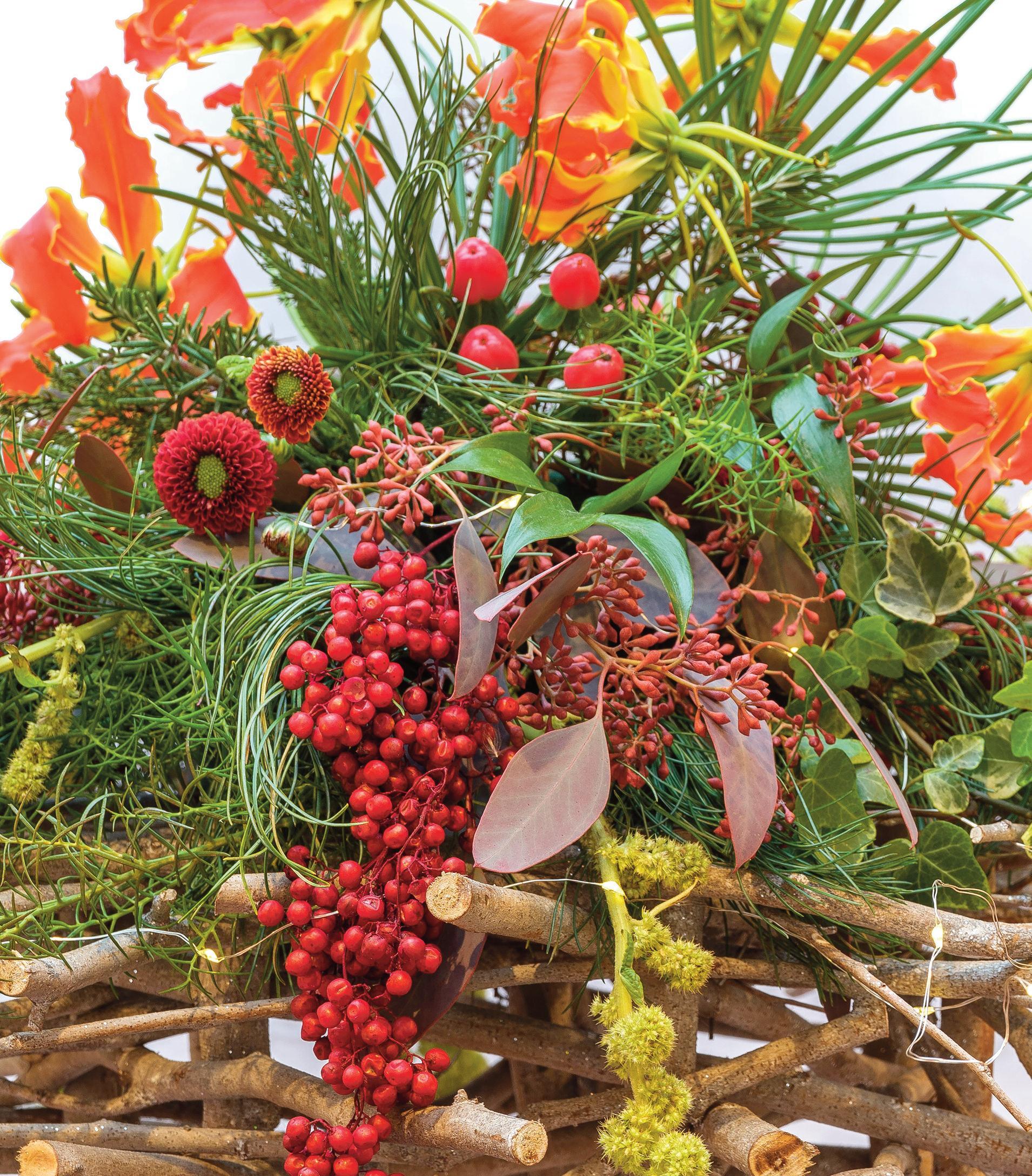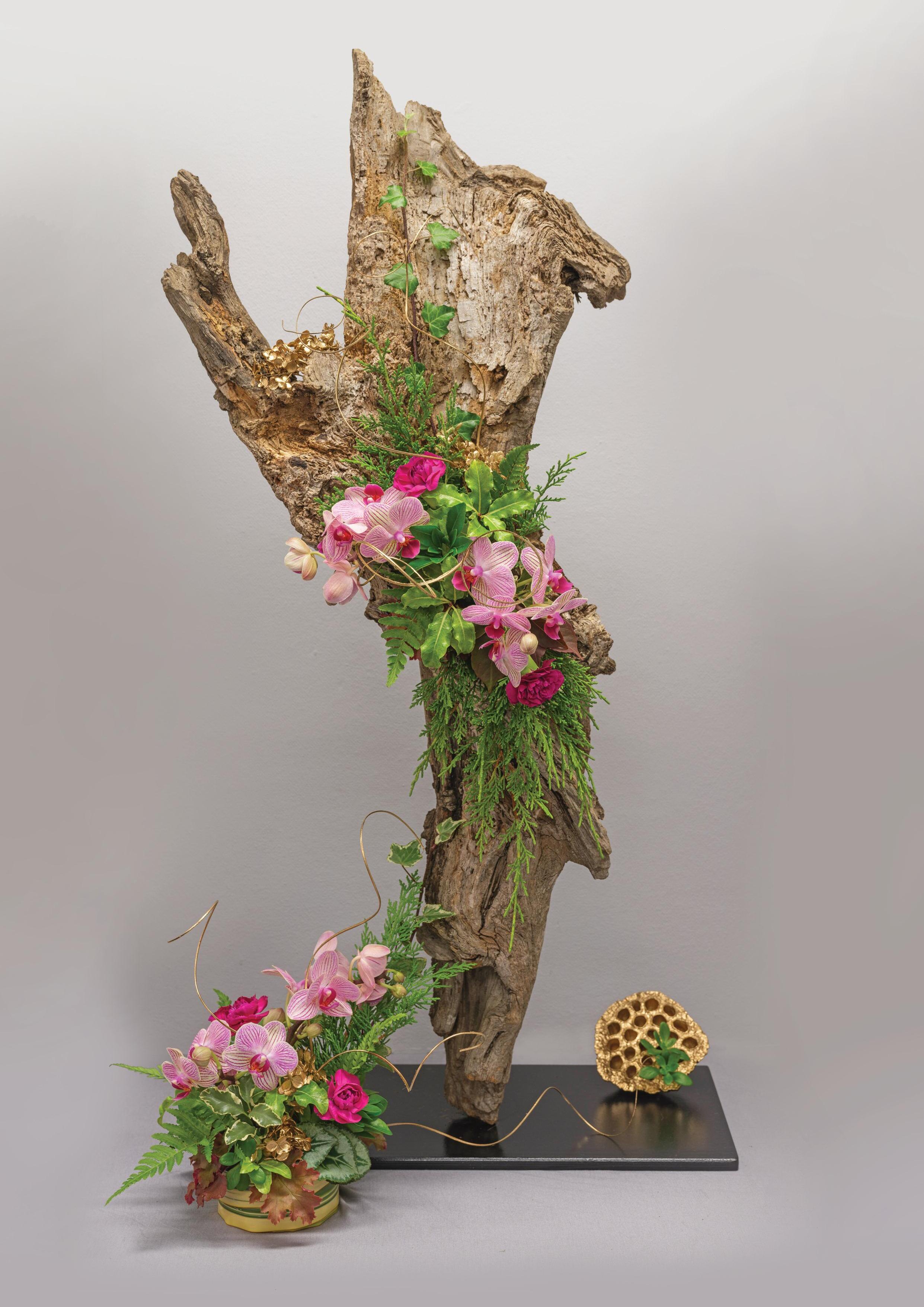 In June, the society met to explore the ar t of foamfree designing Members created delightful table-top arrangements using only natural and fresh materials –with no floral foam in sight As is of ten the case with foam-free work, members rose to the challenge and found inventive ways to suppor t their plant material. The results were imaginative and inspiring, as shown in the selection of designs featured here.
