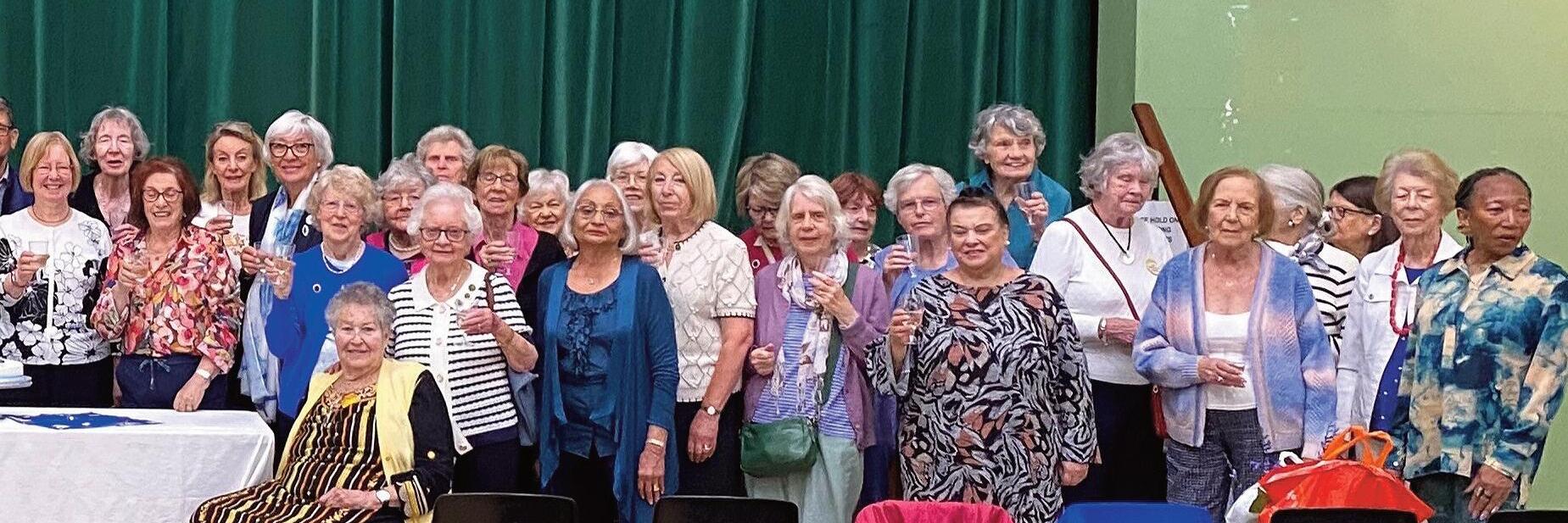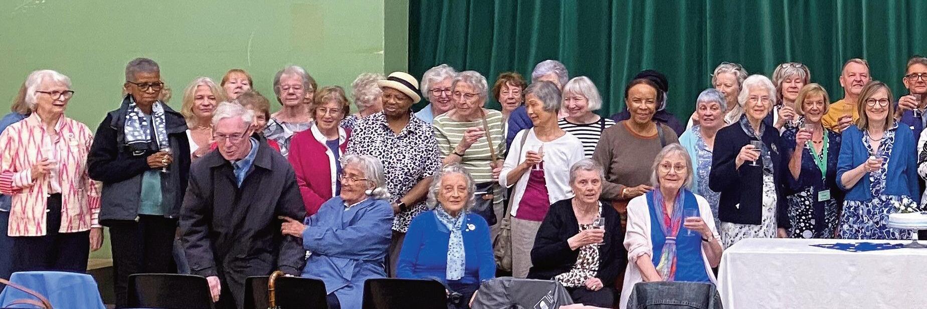 Bromley & District Floral Society (London and Overseas) celebrated its 65th Blue Sapphire Anniversary on 3 June with cake (cake topper designed by Graham Harmer) and a glass of fizz followed by a colourful demonstration by Vivien Withers The club has longstanding members of 40+ years, 25 years and some honorary award badge holders The year ’s celebrations began on 20 May with a thanksgiving service, tea and homemade cakes, and a demonstration by Sue Tausig at St Mary’s Church, Bromley. In August, members and guests enjoyed a Blue Sapphire af ternoon tea at the Bromley Court Hotel with a demonstration by Graham Harmer The photograph shows 50 of the club’s 90 members raising a glass to celebrate 65 years of ‘Fun, Flowers and Friendship’