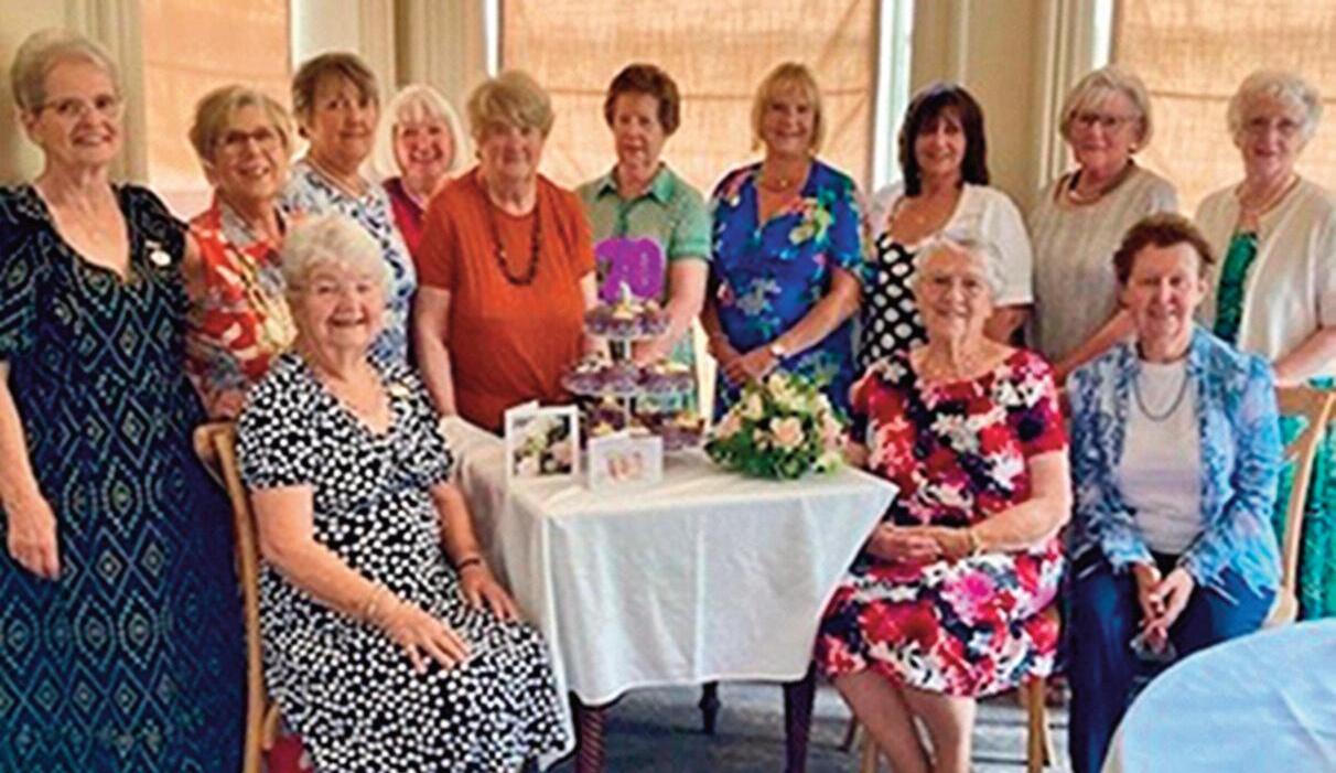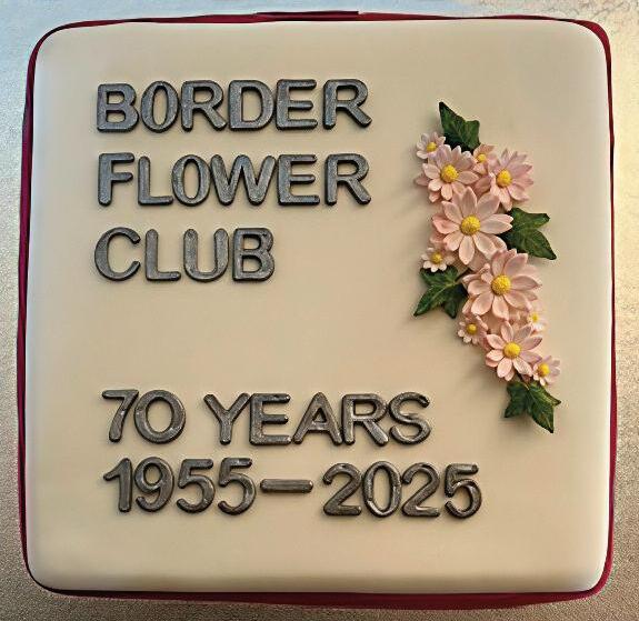 Border Flower Club (SAFAS) celebrated its Platinum Anniversary in May, marking 70 years since its formation They proudly displayed the original poster from their first meeting in October 1955. As it is now a small club, they held an informal af ternoon tea for present and past members Their longest serving member, Nancy Thompson, cut the cake made by Marion Hamilton.