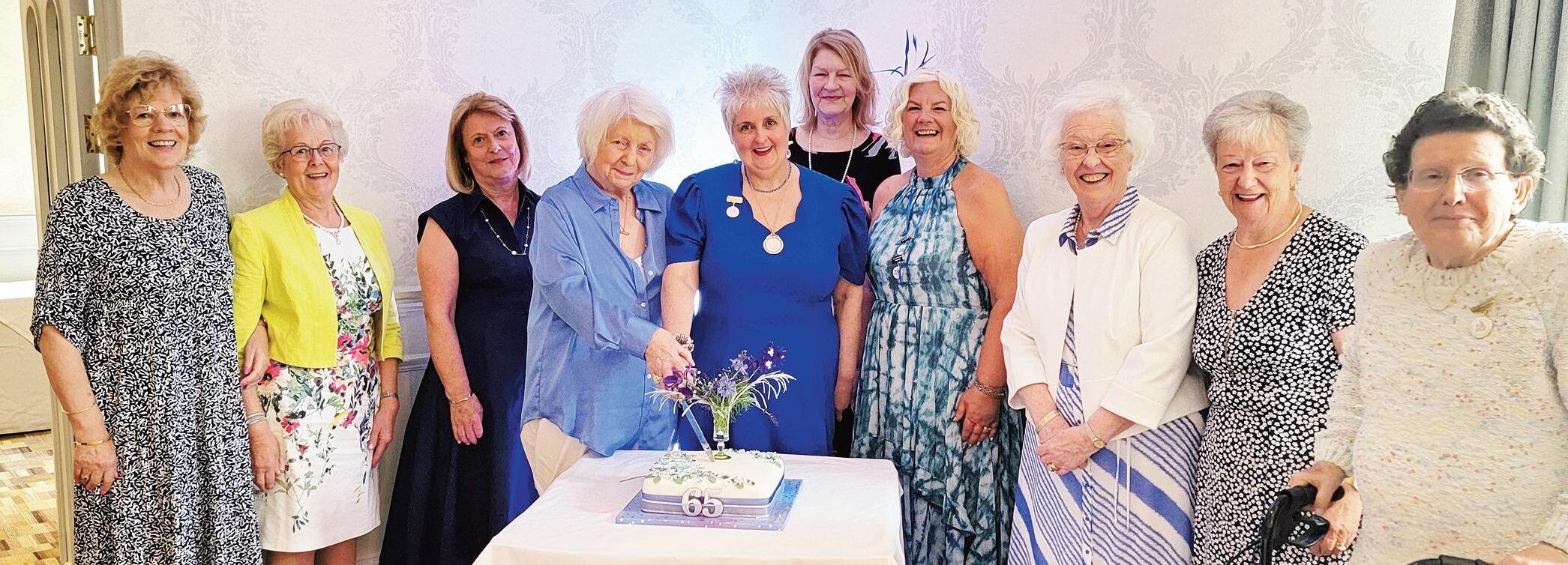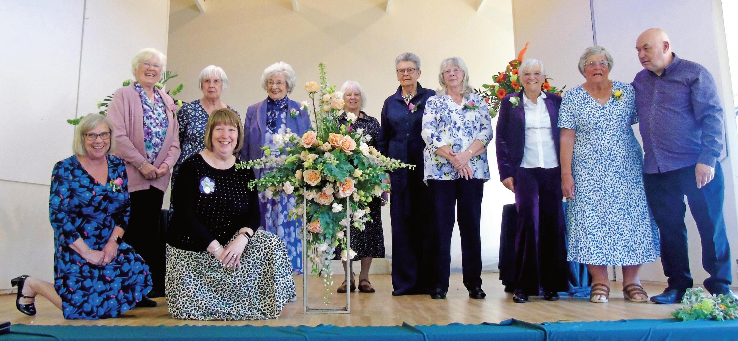 haverfordwest Floral Art Society (Three Counties & South Wales) celebrated its 60th Anniversary in June with af ternoon tea and a floral demonstration by Linda Garratt. Cutting the cake: Caroline Phillips (Chair) with Anne Thomas (Programme Secretary) on her lef t, Anna Daye (Treasurer) front right of her, Christine Hancock (Treasurer) back row, seventh from lef t and club members.