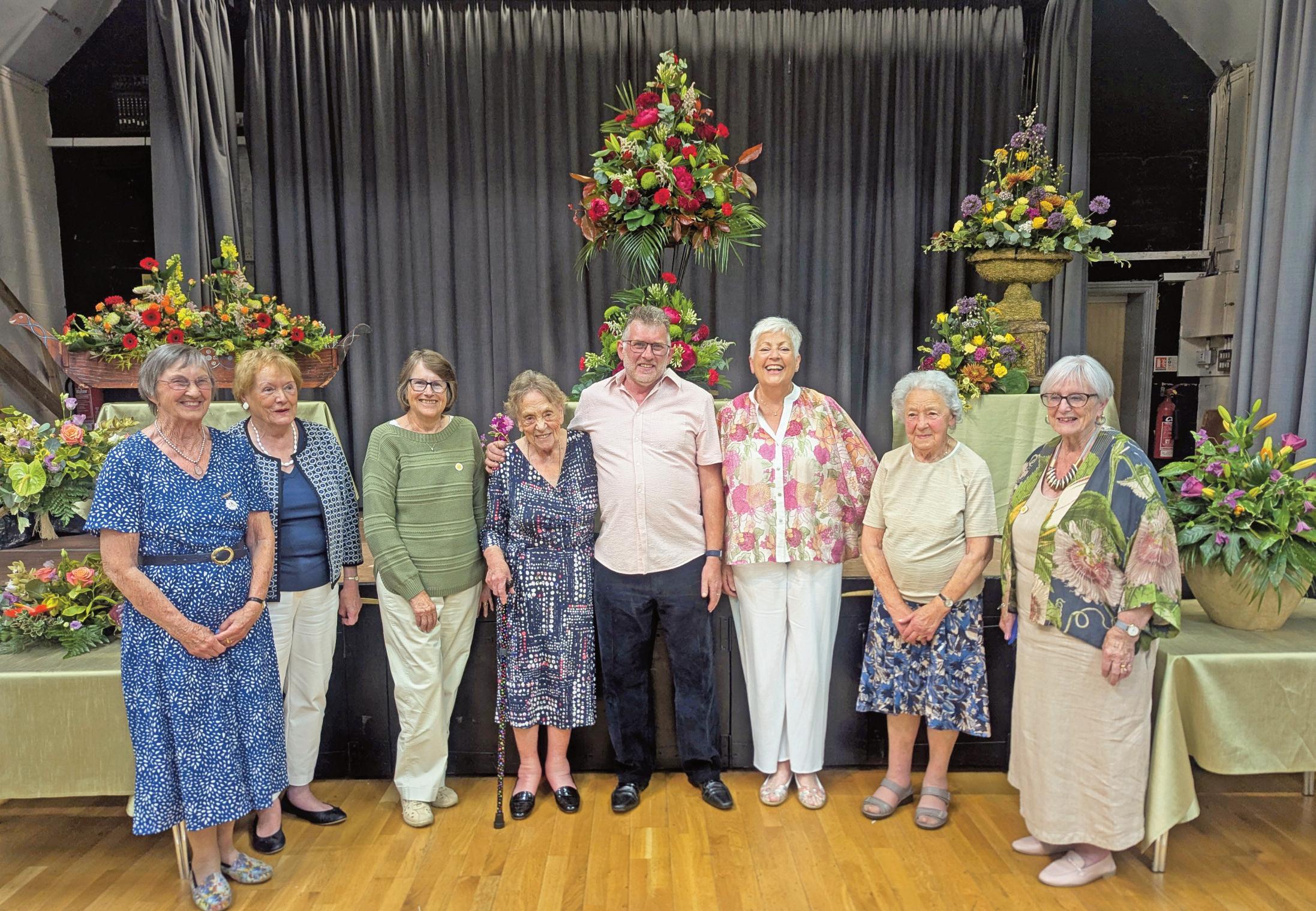 On 28 May the club welcomed Donald Morgan, NAFAS Area Demonstrator and Area Judge, for a special open evening Celebrations began with six members receiving NAFAS long-service awards presented by Ros Anwyl (Area Chair). Sue Harrison received a 40-year award while Ann Pearce, Marilyn Jones, Margaret Ellis, Venice Turrell and Joan Gregory each received a 50-year award Together these achievements represent 290 years of dedication to the club