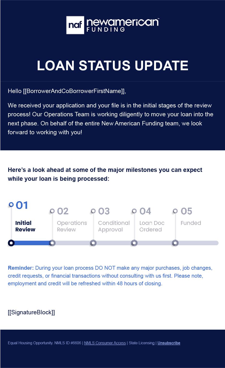 New American Funding keeps you top of mind with co-branded Loan Status update emails to keep the client in the loop every step of the way.