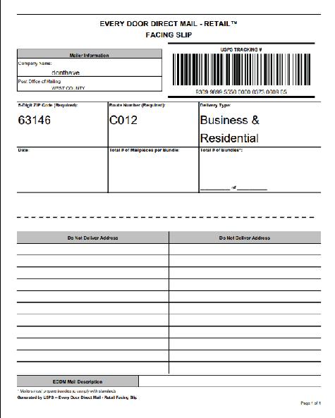 After payment is complete, USPS® will generate the required EDDM® paperwork, including a Mailing Statement and Facing Slips for each selected route.