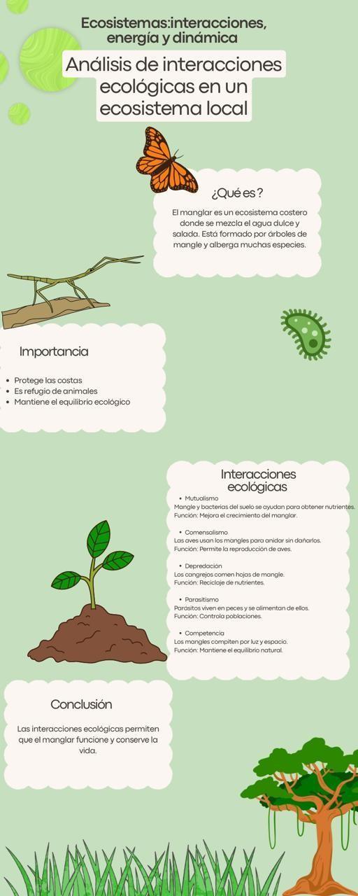 Las principales interacciones ecológicas involucradas en este emprendimiento son las relaciones entre plantas y animales, especialmente la polinización. Las abejas transportan polen de una flor a otra, lo que permite la reproducción de las plantas y favorece la diversidad vegetal del bosque.