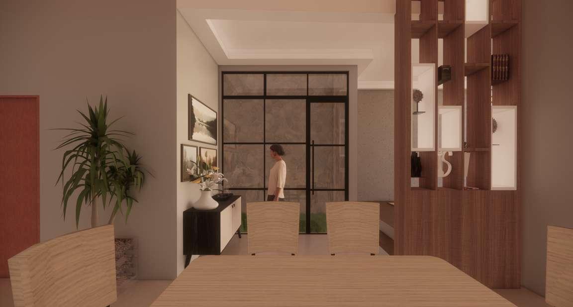 The dining room is in the middle of the room opposite the mini garden, which is at the back of the house.
